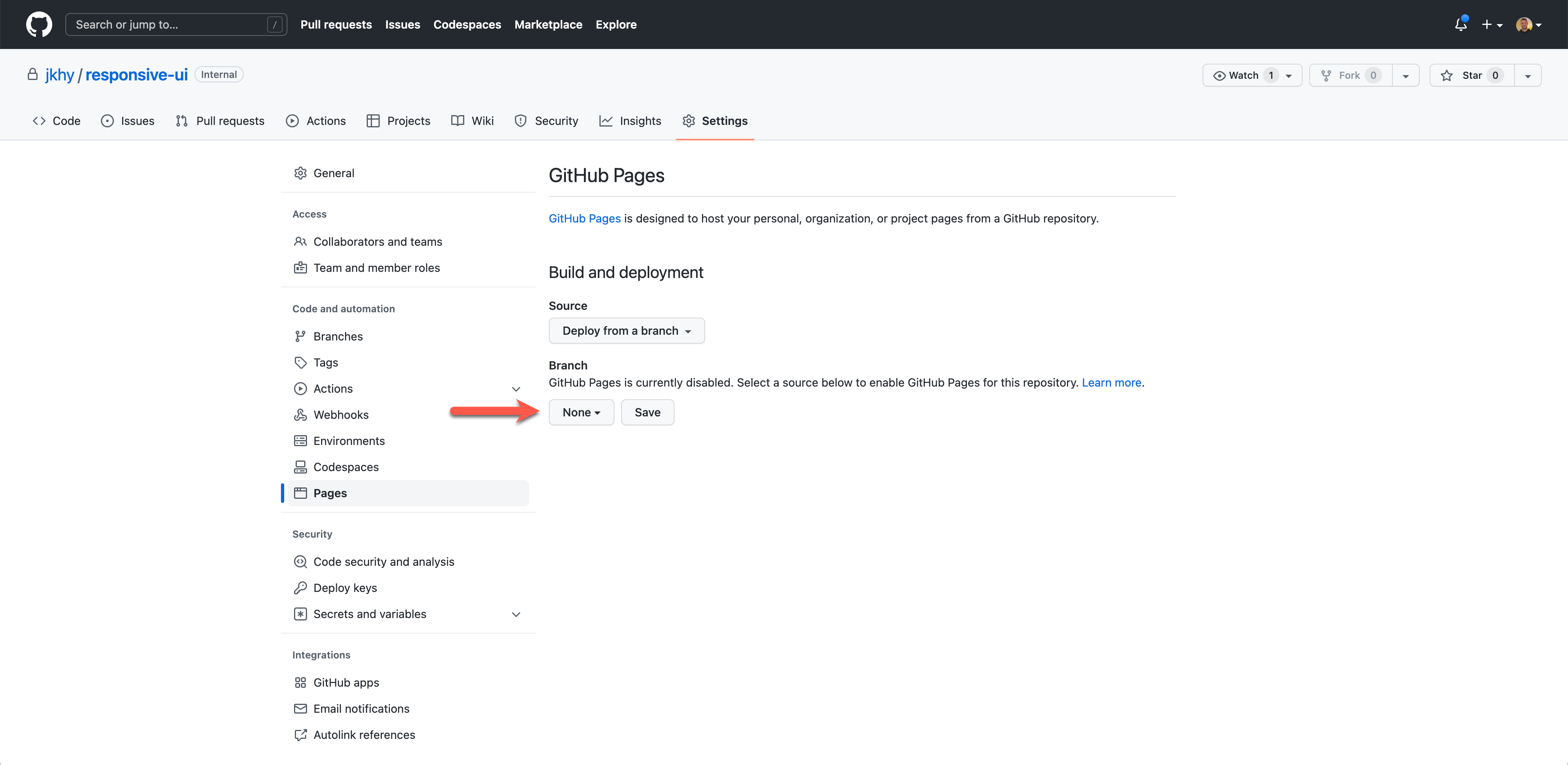 At this point, GitHub Pages has not been configured yet. In the screenshot below, you can see that the Branch dropdown is set to a value of None.