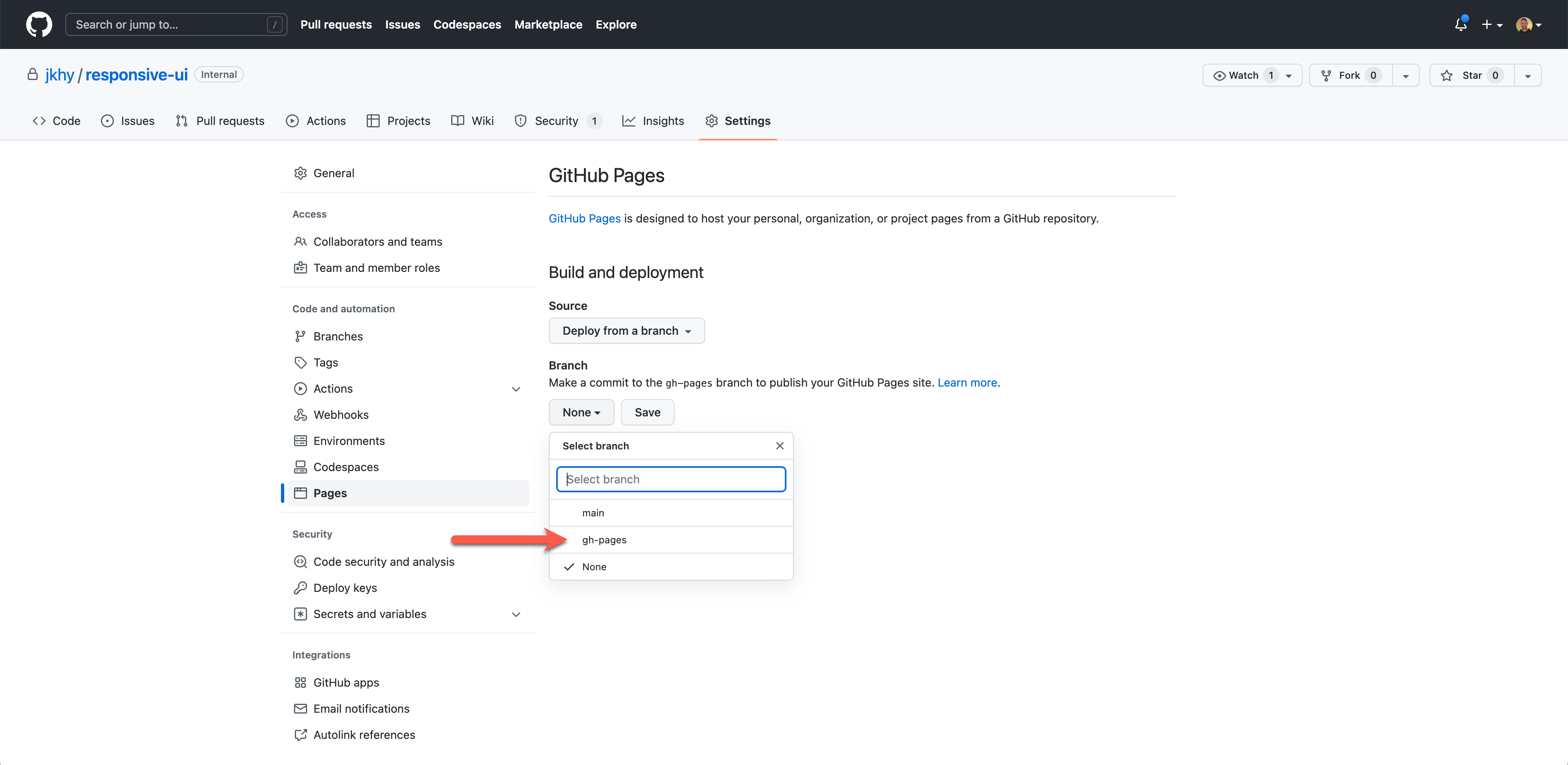 In the Branch dropdown, select the gh-pages option. The build and deploy script generates your site into a gh-pages branch, which it then deploys as your live site.