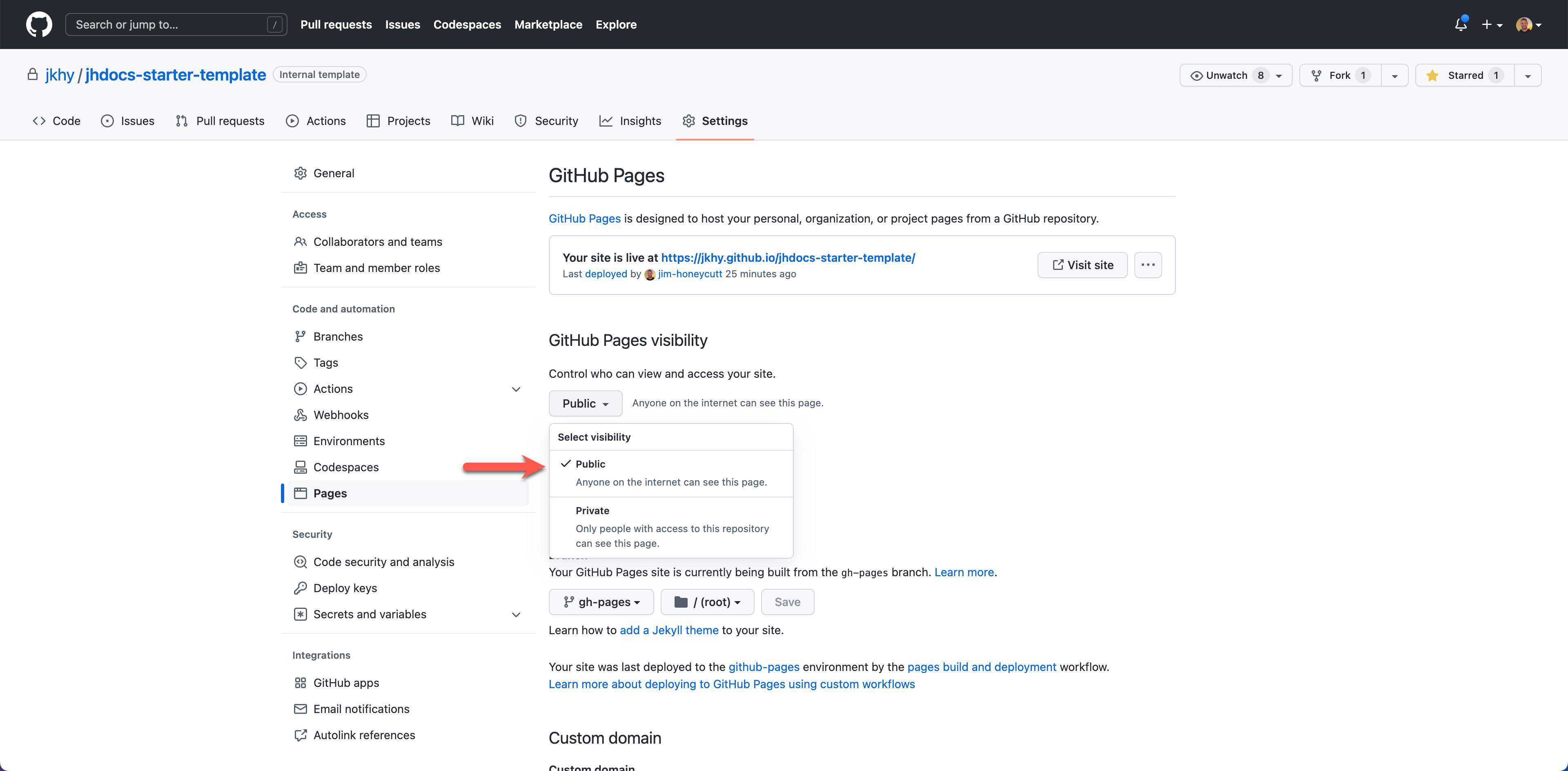 The rest of this section assumes that you’re hosting your jhDocs site in GitHub Pages as a publicly accessible website.
