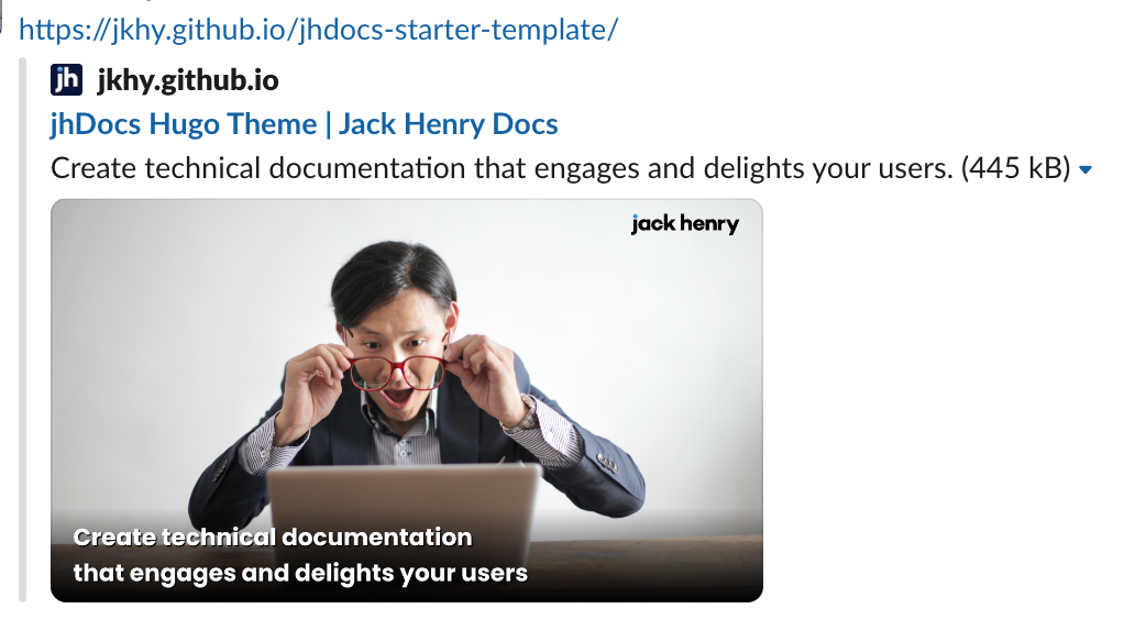 local-head.html, users will see a professional looking image and description when sharing links to your doc site. - Here’s an example of the Open Graph card for this site: