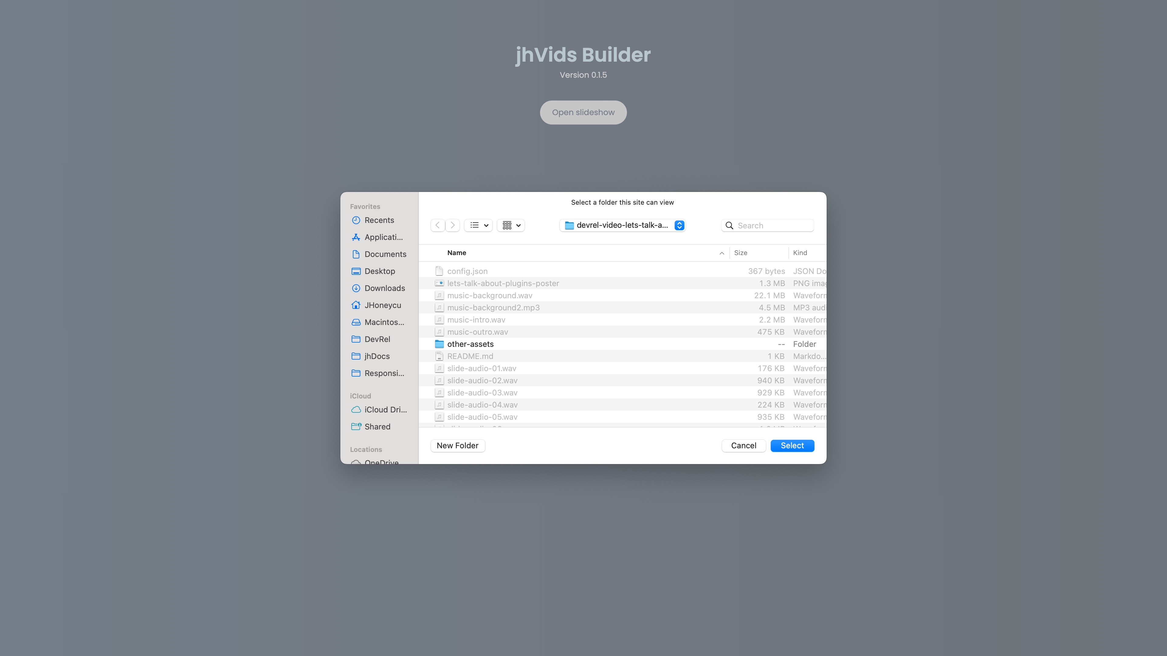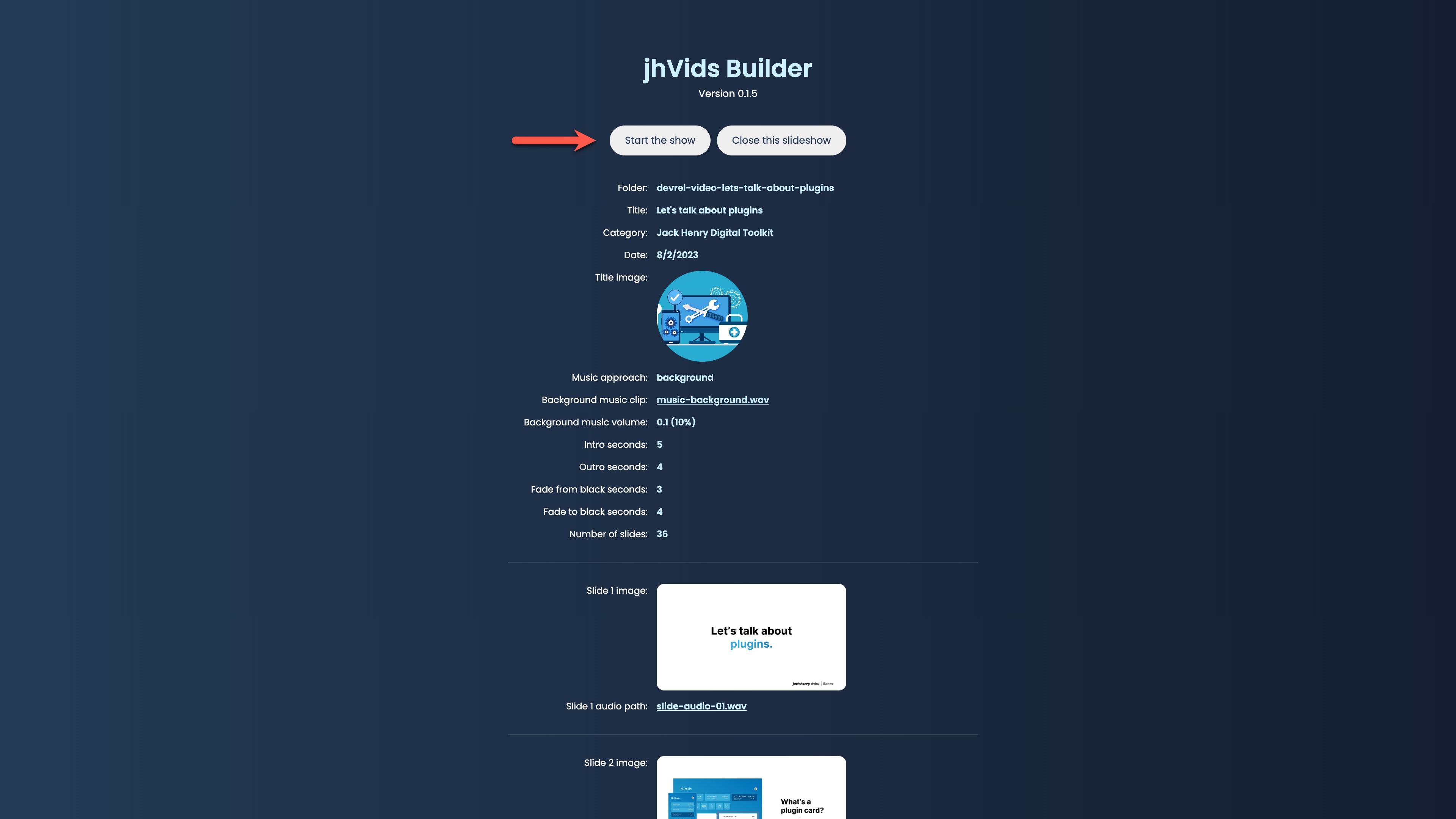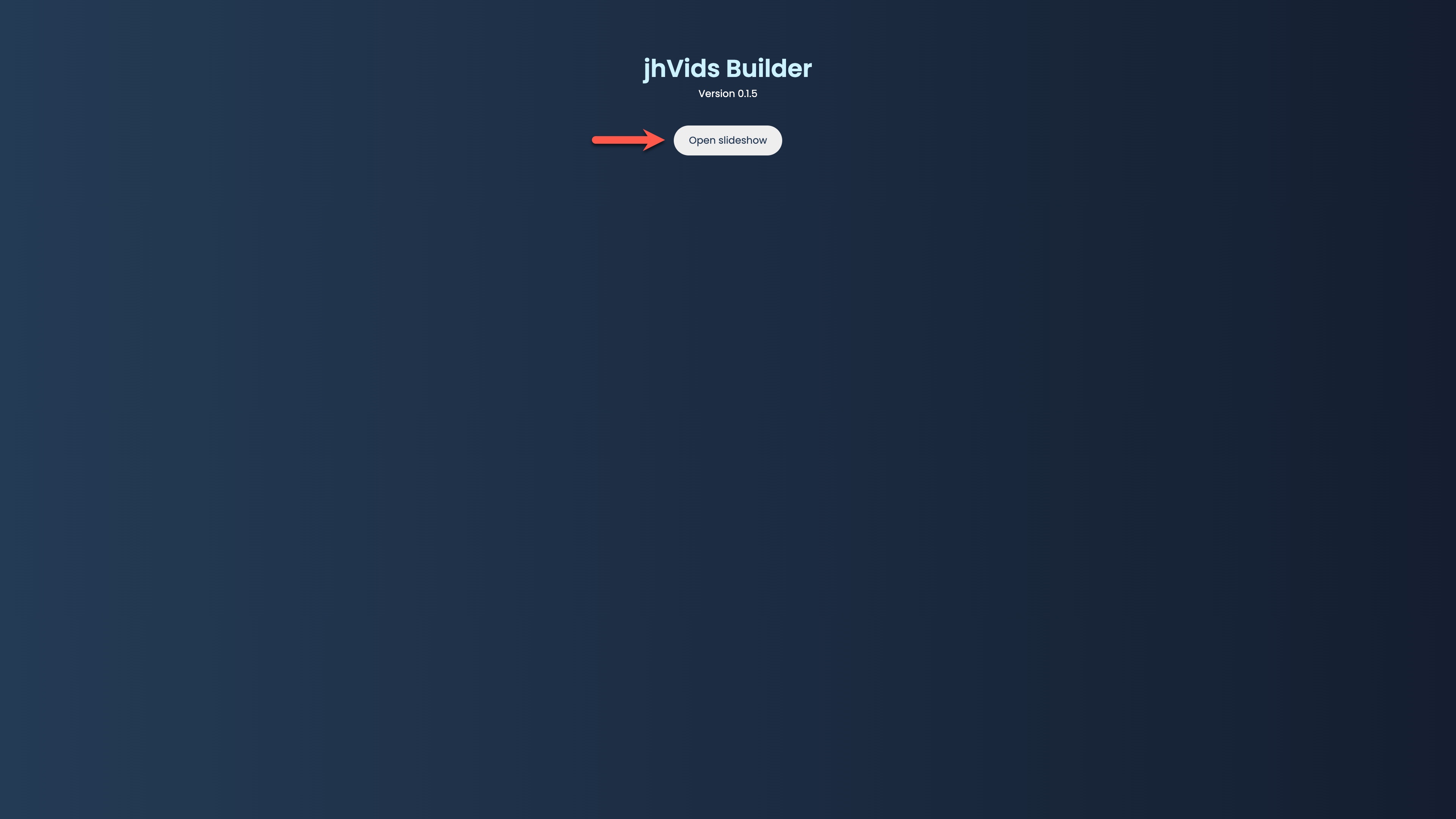 Open the jhVids Builder web app in the Chrome or Edge browser. Press the Open slideshow button.
