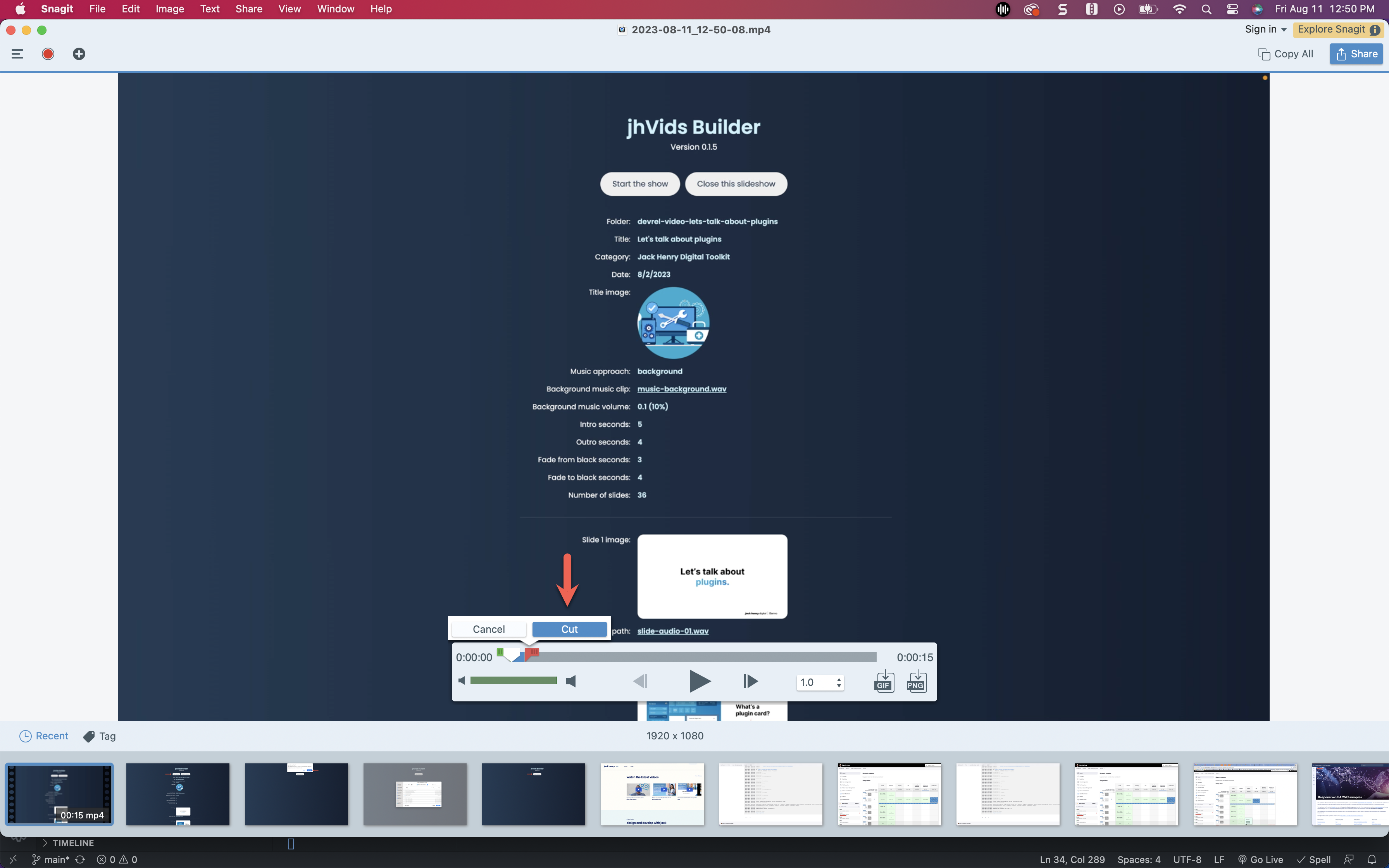 - Move the play head in the video timeline scrubber a little to the right until you no longer see the jhVids Builder slideshow info and see the initial black screen.