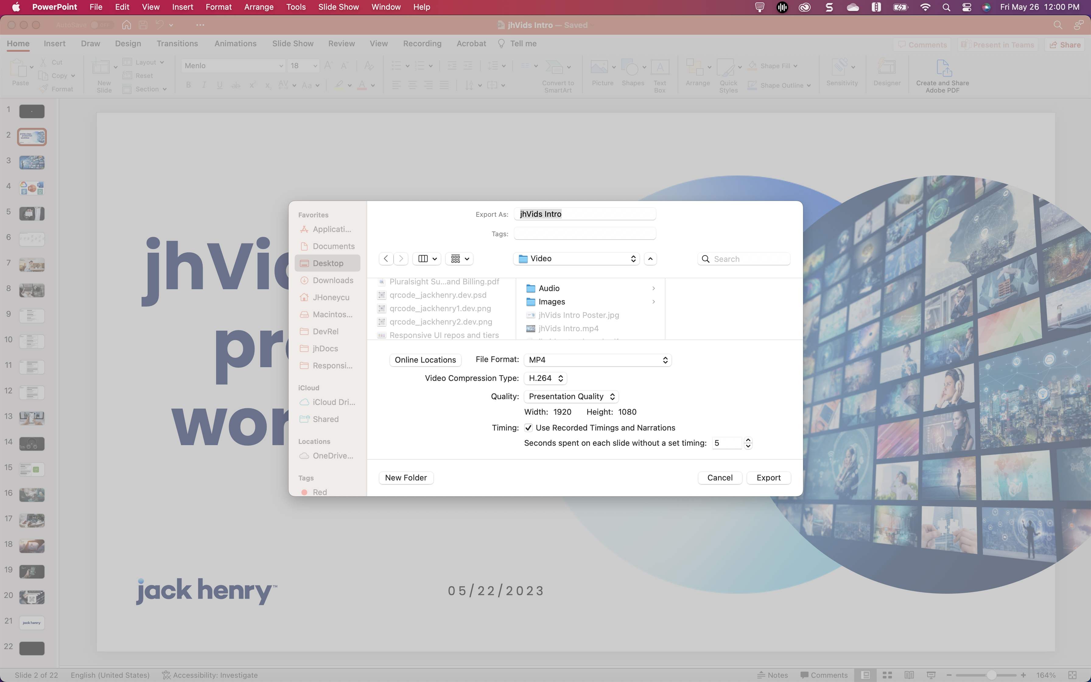 Once you have all the slide timings worked out, export the Powerpoint presentation as a video.