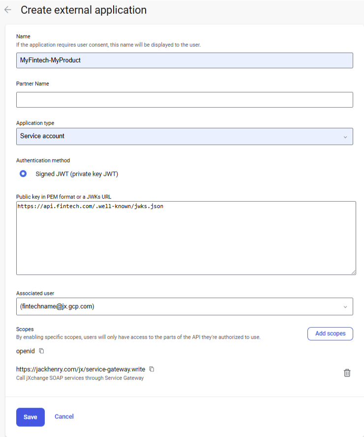 This guide is designed for API consumers to provide to a financial institution’s back office administrator. It outlines the necessary steps and information required to establish a new external application for service-to-service integration. Completing this process correctly is essential for authorizing your integration with the Jack Henry platform. Feel free to add your specific Fintech name and product name, along with JWKs URL when providing these instructions to customers.