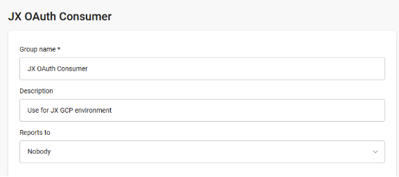 - Navigate to Groups and create a new group (e.g., “JX OAuth Consumer”). Do not assign any permissions to this group.