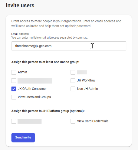 - Invite a new user using a “dummy” email (e.g., fintechname@yourbank.com).